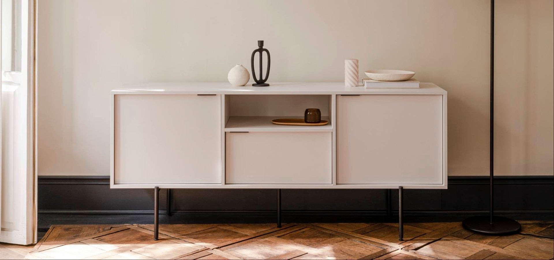 Pairing warm beige with cold grey will provide an interesting effect of two contrasting hues of the same intensity. For those who prefer all-neutral color palettes, beige and white will always be a safe choice. If the café-au-lait surroundings seem too meek, try to introduce some darker accents, such as black or navy blue. The Suumo Sideboard in Midnight Blue will instantly become a forte of any neutral style home.