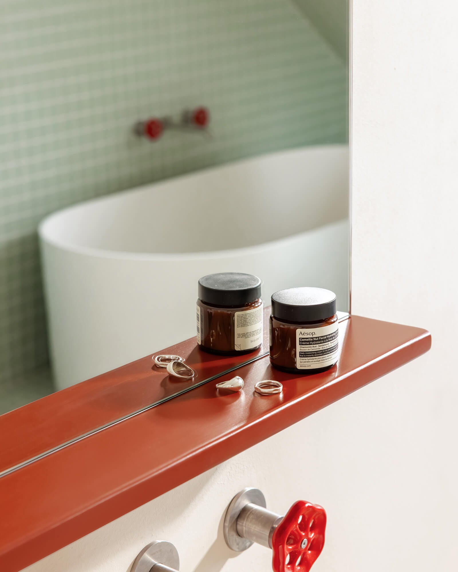 Lun is a wall mirror designed with simplicity in mind. Its wooden frame — available in classic oak or playful two-tone finishes — is coated with a protective layer, making it suitable for bathroom use. The elegant geometric form enhances any interior without compromising on functionality.