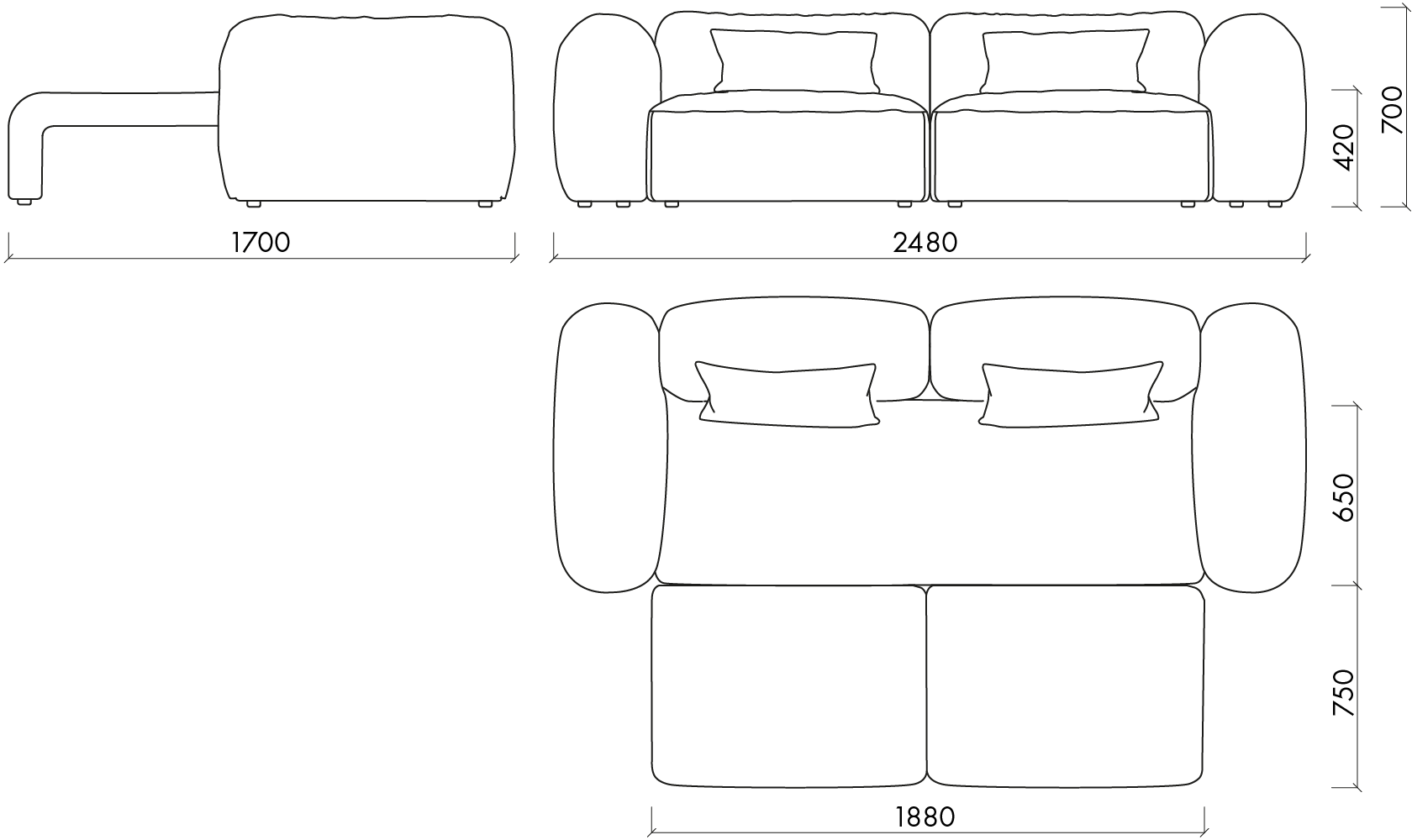 - Backrests: hardwood frame, 50% polyester wadding, 50% silicone filling, wadding